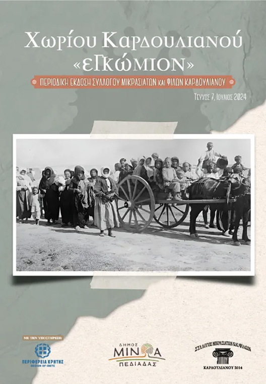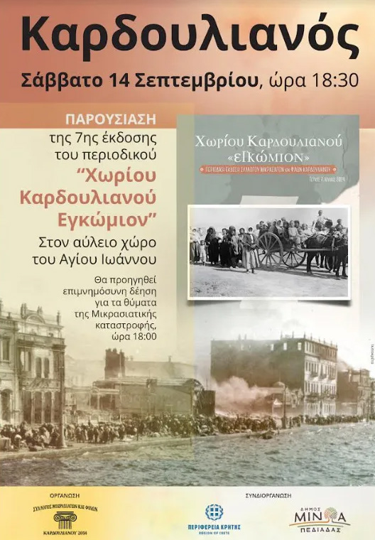 Ο Σύλλογος Μικρασιατών και Φίλων Καρδουλιανού το Σάββατο 14 Σεπτεμβρίου 2024 και ώρα 18.30 με την στήριξη της Περιφέρειας Κρήτης παρουσιάζει το 7ο τεύχος του περιοδικού «ΧΩΡΙΟΥ ΚΑΡΔΟΥΛΙΑΝΟΥ ΕΓΚΩΜΙΟΝ» στον αύλειο χώρο του ιερού ναού Αγίου Ιωάννου στον Καρδουλιανό.