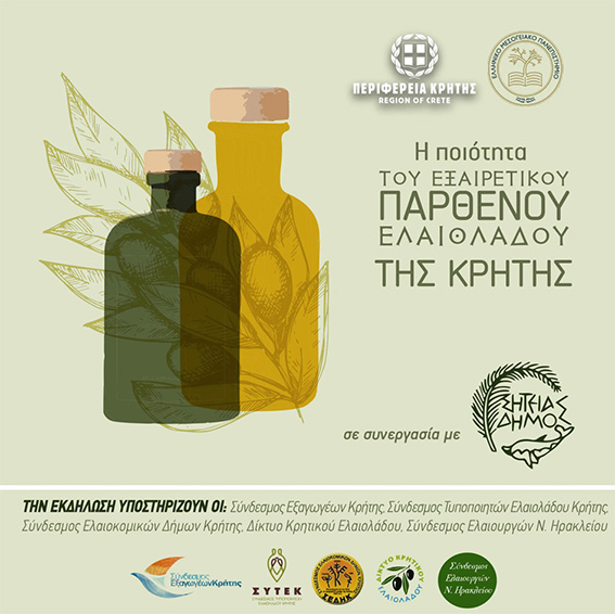 Η Περιφέρεια Κρήτης και το Ελληνικό Μεσογειακό Πανεπιστήμιο, σε συνεργασία με το Δήμο Σητείας, διοργανώνουν εσπερίδα με τίτλο «Οργανοληπτική αξιολόγηση του Εξαιρετικού Παρθένου Ελαιόλαδου Κρήτη / “Kriti” και οι παράγοντες που την επηρεάζουν», η οποία θα πραγματοποιηθεί την Παρασκευή 20 Σεπτεμβρίου 2024, στις 17:00 μ.μ, στο Οικομουσείο Σητείας (πρώην Κ.Ε.Γ.Ε.) στη Σητεία.
