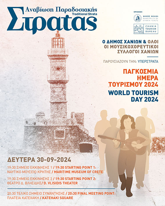 Ο Δήμος Χανίων, με αφορμή τον εορτασμό της Παγκόσμιας Ημέρας Τουρισμού, παρουσιάζει τη Δευτέρα 30 Σεπτεμβρίου 2024 την «Υπερ-Στράτα, Τελετή Λήξης της παραδοσιακής Στράτας 2024». Πρόκειται για την κορύφωση της Παραδοσιακής Στράτας, που εδώ και τρία χρόνια γεμίζει τα καλοκαίρια με την παράδοση της πόλης των Χανίων.