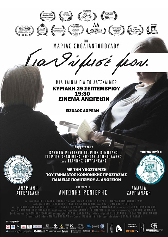 Στις 21 Σεπτεμβρίου 2023, Παγκόσμια ημέρα Αλτσχάιμερ, η ταινία προβλήθηκε στο Λουξεμβούργο σε συνεργασία με την Ελληνική Κινηματογραφική Λέσχη Λουξεμβούργου ενώ στις 28 & 29 Οκτωβρίου στα Palace Cinema της Μελβούρνης, στο πλαίσιο του Ελληνικού Φεστιβάλ της Αυστραλίας. Τα έσοδα έχουν διατεθεί στην Αλληλεγγύη Ηρακλείου.