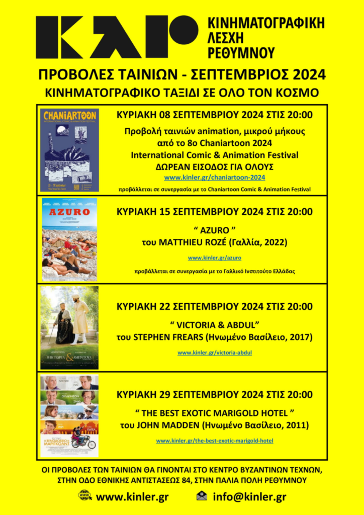 Η Κινηματογραφική Λέσχη Ρεθύμνου (ΚΙΝ.ΛΕ.Ρ) μετά τις καλοκαιρινές διακοπές, επιστρέφει δυναμικά στις καθιερωμένες κυριακάτικες προβολές της!