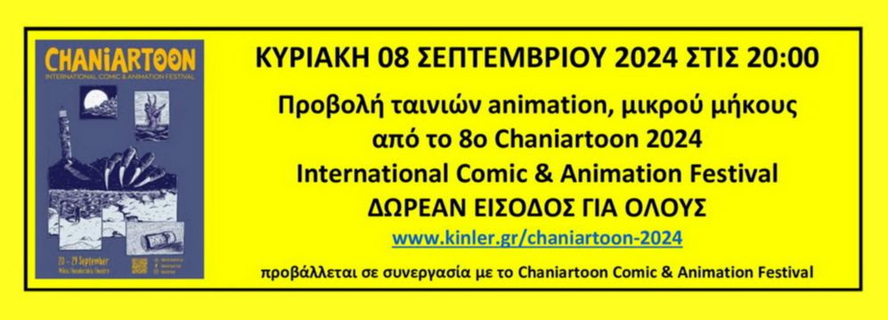 Την Κυριακή 8 Σεπτεμβρίου 2024, στις 20:00, η ΚΙΝ.ΛΕ.Ρ. σε συνεργασία με το Διεθνές Φεστιβάλ Comic & Animation «Chaniartoon» παρουσιάζει ένα πρόγραμμα με ταινίες animation, συνολικής διάρκειας περίπου δύο ωρών. Το κοινό θα έχει την ευκαιρία να απολαύσει μερικές από τις καλύτερες ταινίες κινουμένων σχεδίων μικρού μήκους που ξεχώρισε η κριτική επιτροπή του φεστιβάλ γι’ αυτή τη χρονιά, με βάση την πρωτοτυπία, το σενάριο, τη σκηνοθεσία, την τεχνική αρτιότητα, τον ρυθμό και τη μουσική.