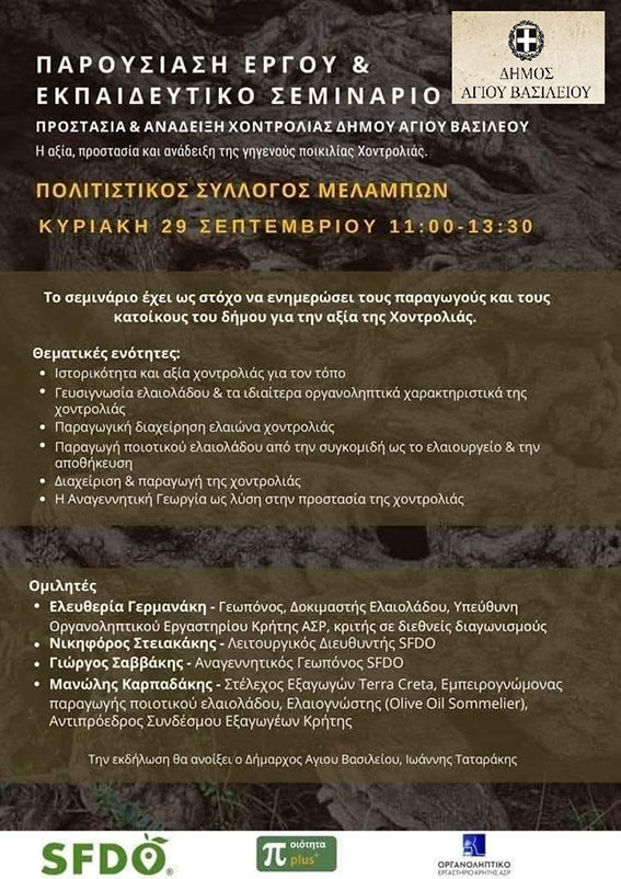 - Εργαστήρια εκπαίδευσης παραγωγών στις καλές πρακτικές καλλιέργειας και συγκομιδής της Χοντρολιάς.