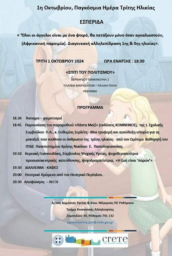 Το Τμήμα Κοινωνικής Αλληλεγγύης της Διεύθυνσης Δημόσιας Υγείας και Κοινωνικής Μέριμνας Π.Ε. Ρεθύμνης, διοργανώνει Εσπερίδα την Τρίτη 1 Οκτωβρίου 2024 και ώρα 18:30, στο πλαίσιο της Παγκόσμιας Ημέρας Τρίτης Ηλικίας με θέμα «Όλοι οι άγγελοι είναι με ένα φτερό, θα πετάξουν μόνο όταν αγκαλιαστούν΄ (Αφρικανική παροιμία). Διαγενεακή αλληλεπίδραση 1ης & 3ης ηλικίας». στο «Σπίτι του Πολιτισμού» στο Ρέθυμνο.