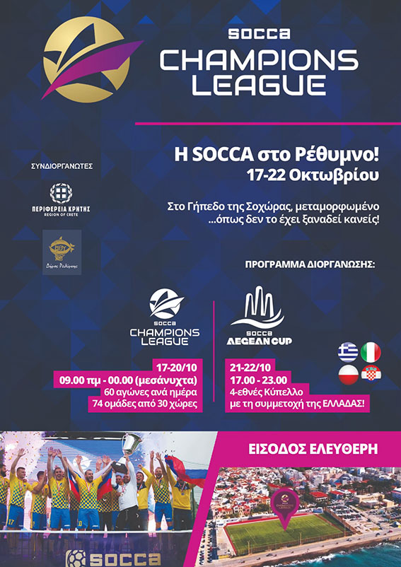 Από τις 17 έως τις 20 Οκτωβρίου θα διεξαχθεί το SOCCA Champions League, η κορυφαία διοργάνωση του κόσμου σε επίπεδο συλλόγων, ενώ θα ακολουθήσει (21-22 Οκτωβρίου) το τετραεθνές Τουρνουά SOCCA Aegean Cup.