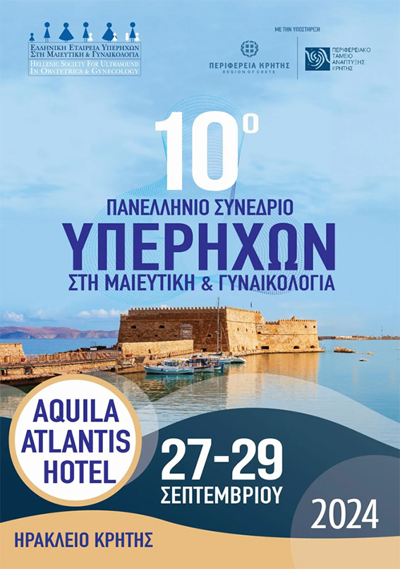 Η Ελληνική Εταιρεία Υπερήχων στη Μαιευτική & Γυναικολογική (Ε.Ε.Υ.Μ.Γ.), διοργανώνει το 10ο Πανελλήνιο Συνέδριο Υπερήχων στη Μαιευτική και Γυναικολογία, 27-29 Σεπτεμβρίου 2024 στο AQUILA ATLANTIS HOTEL με την υποστήριξη της Περιφέρειας Κρήτης, του Περιφερειακού Ταμείου Ανάπτυξης Κρήτης και του Δήμου Ηρακλείου.
