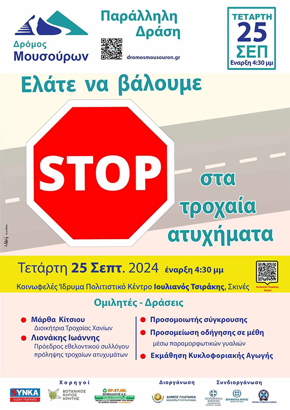 - την Τετάρτη 25 Σεπτεμβρίου και ώρα 16:30μ.μ., θα πραγματοποιηθεί η παράλληλη δράση, που διοργανώνεται για τρίτη συνεχόμενη χρονιά, με θέμα “ Ελάτε να βάλουμε STOP στα Τροχαία Ατυχήματα”, στο χώρο του Κοινωφελούς Ιδρύματος “Πολιτιστικό Κέντρο Ιουλιανός Τσιράκης” στο Σκινέ.