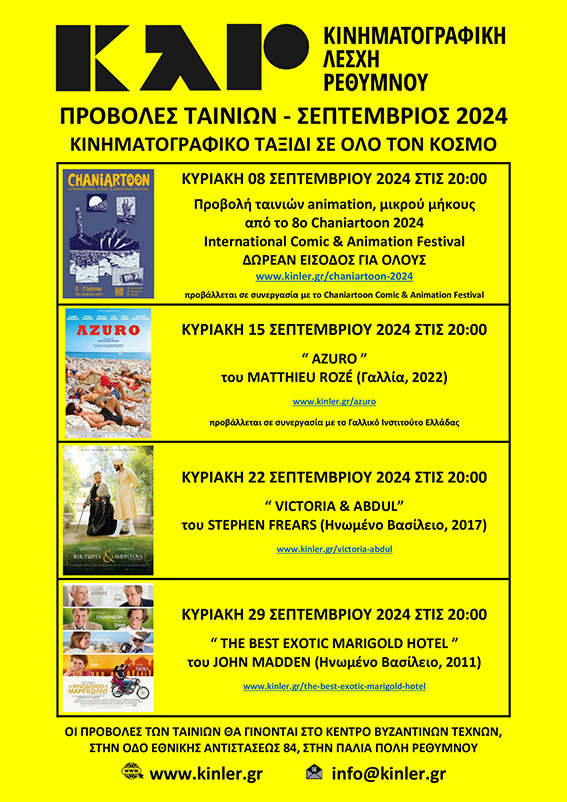 Η Κινηματογραφική Λέσχη Ρεθύμνου (ΚΙΝ.ΛΕ.Ρ) συνεχίζει το ‘κινηματογραφικό της ταξίδι σε όλο τον κόσμο’ με μια δραματική κωμωδία βρετανικής παραγωγής του 2011, η οποία έχει τον τίτλο “Εξωτικό Ξενοδοχείο Μάριγκολντ”, σε σκηνοθεσία John Madden.