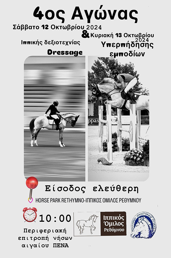 Ο ιππικός όμιλος Horse Park Rethymno-Ιππικός Όμιλος Ρεθύμνου φιλοξενεί τους Αγώνες Ιππασίας που διοργανώνει η Ελληνική Ομοσπονδία Ιππασίας (Περιφερειακή Επιτροπή Νήσων Αιγαίου Π.Ε.Ν.Α.) στο Ρέθυμνο, το Σάββατο 12 και την Κυριακή 13 Οκτωβρίου 2024.