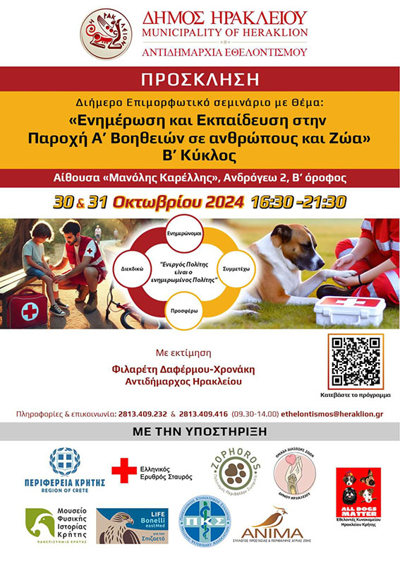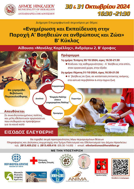 Στο πλαίσιο αυτό διοργανώνει διήμερο επιμορφωτικό σεμινάριο με θέμα «Ενημέρωση και Εκπαίδευση στην Παροχή Α’ Βοηθειών σε ανθρώπους και Ζώα» – Β΄ Κύκλος.