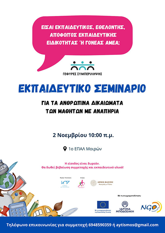 Οι εκπαιδεύσεις που θα πραγματοποιηθούν σε όλη την Κρήτη, θα γίνουν δια ζώσης δωρεάν από το πρόγραμμα Γέφυρες Συμπερίληψης μέσω του προγράμματος BUILD του Bodossaki Foundation – Ίδρυμα Μποδοσάκη που συνδιοργανώνουν ως εταίροι δύο γνωστοί ελληνικοί φορείς. Από τη μία ο φορέας με πανελλήνια εμβέλεια Διαβάζω για τους άλλους με Έδρα την Αθήνα, που είναι ο Φορέας Υλοποίησης του Έργου και από την άλλη ένας Κρητικός σύλλογος, ο Σύλλογος Γονέων Κηδεμόνων και Φίλων Ατόμων με Αυτισμό Ν. Ρεθύμνου, με πλούσια κοινωνική δράση πολυεπίπεδα για τα άτομα με αυτισμό και νοητική αναπηρία που λειτουργεί ως Εταίρος.