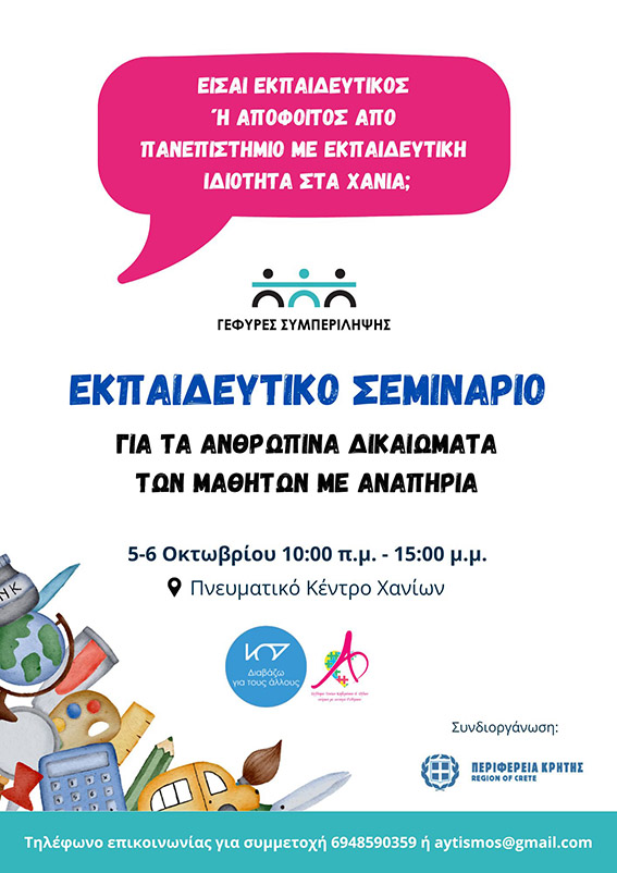Οι εκπαιδεύσεις που θα πραγματοποιηθούν σε όλη την Κρήτη, θα γίνουν δια ζώσης δωρεάν από το πρόγραμμα ΓΕΦΥΡΕΣ ΣΥΜΠΕΡΙΛΗΨΗΣ μέσω του προγράμματος BUILT του Ιδρύματος Μποδοσάκη, σε συνεργασία με τους φορείς Διαβάζω για τους Άλλους, με Έδρα την Αθήνα, και του Συλλόγου Γονέων Κηδεμόνων και Φίλων Ατόμων με Αυτισμό Ν. Ρεθύμνου.