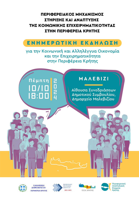 Η εκδήλωση οργανώνεται από την Περιφέρεια Κρήτης και την Περιφερειακή Αναπτυξιακή Εταιρεία Κρήτης ΑΕ σε συνεργασία με το Δήμο Μαλεβιζίου στα πλαίσια του έργου με τίτλο «Λειτουργία Περιφερειακού Μηχανισμού Στήριξης και Ανάπτυξης της Κοινωνικής Επιχειρηματικότητας στην Περιφέρεια Κρήτη» Άξονας Προτεραιότητας 1.3 «Προώθηση αποτελεσμάτων έρευνας, καινοτομίας και τεχνολογίας στις επιχειρήσεις », Κωδικός ΟΠΣ 5214799 του ΠΠΑ ΠΕΡΙΦΕΡΕΙΑΣ ΚΡΗΤΗΣ 2021-2025.