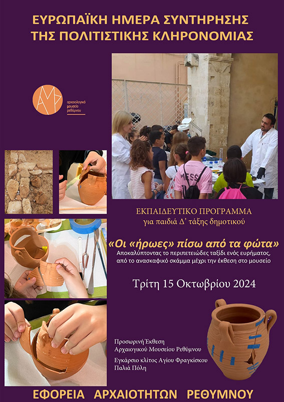 Η Εφορεία Αρχαιοτήτων Ρεθύμνου και το Τμήμα Συντήρησης Αρχαιοτήτων και Έργων Τέχνης, συμμετέχοντας στον εορτασμό των Ευρωπαϊκών Ημερών Συντήρησης διοργανώνει το εκπαιδευτικό πρόγραμμα με τίτλο «Αποκαλύπτοντας το περιπετειώδες ταξίδι ενός ευρήματος, από το ανασκαφικό σκάμμα μέχρι την έκθεση στο μουσείο II».