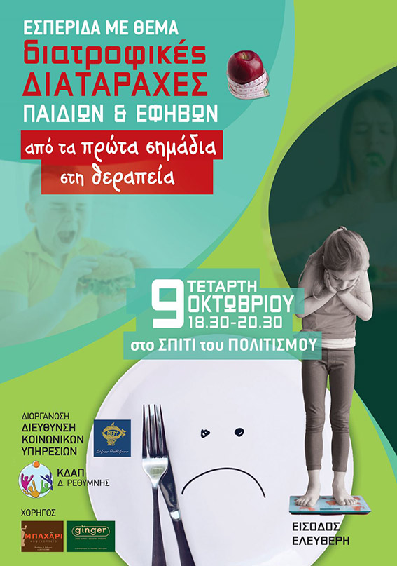 Το ευαίσθητο θέμα των διαταραχών που εμφανίζουν έφηβοι και νέοι στη διατροφή τους προσεγγίζουν, με τη συνδρομή εξειδικευμένων επιστημόνων, η Κοινωνική Υπηρεσία και τα ΚΔΑΠ του Δήμου Ρεθύμνης με την επίκαιρη Εσπερίδα που διοργανώνουν την Τετάρτη 9 Οκτωβρίου 2024, στο «Σπίτι Πολιτισμού», στο Ρέθυμνο.