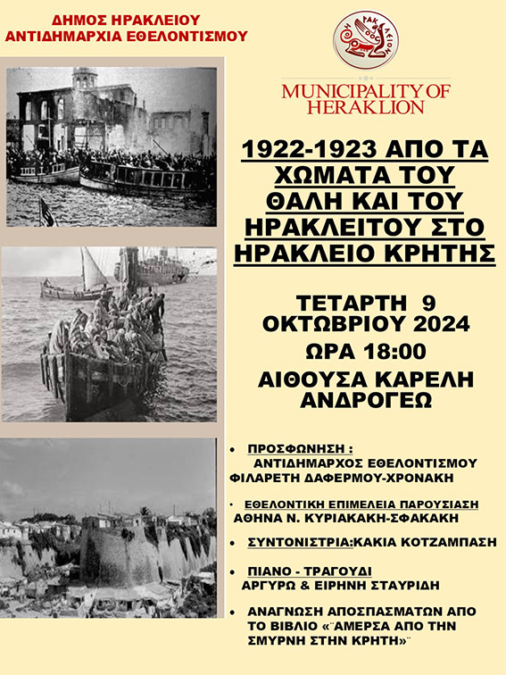 Μνήμες από τον ξεριζωμό των Ελλήνων της Μικράς Ασίας και την προσφυγιά θα «ζωντανέψουν» την Τετάρτη 9 Οκτωβρίου 2024, στη διάρκεια της εκδήλωσης που διοργανώνει ο Δήμος Ηρακλείου -Αντιδημαρχία Εθελοντισμού, στις 18:00 το απόγευμα στην αίθουσα «Μ.Καρέλης» στο Δημοτικό κτίριο της οδού Ανδρόγεω.