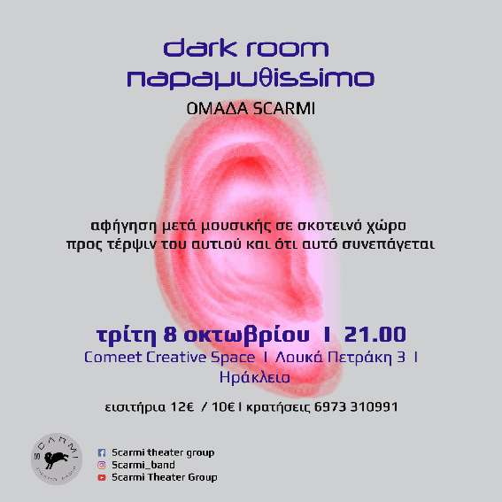 To Dark Room Παραμυθissimo, -αφήγηση μετά μουσικής σε σκοτεινό χώρο προς τέρψη του αυτιού και ότι αυτό συνεπάγεται- παρουσιάζεται στο Comeet Creative Space στο Ηράκλειο.