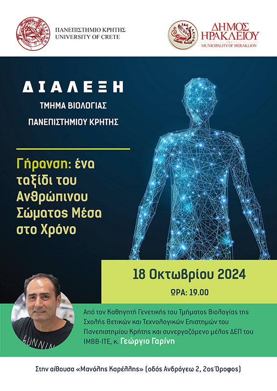 Η πρώτη ομιλία θα πραγματοποιηθεί την Παρασκευή 18 Οκτωβρίου 2024 στις 19:00 μ.μ στην αίθουσα «Μ. Καρέλης» της οδού Ανδρόγεω, από τον Καθηγητή Γενετικής του Τμήματος Βιολογίας της Σχολής Θετικών και Τεχνολογικών Επιστημών του Πανεπιστημίου Κρήτης και συνεργαζόμενο μέλος ΔΕΠ του ΙΜΒΒ-ΙΤΕ, Γεώργιο Γαρίνη, με θέμα: «Γήρανση: Ένα ταξίδι του Ανθρώπινου Σώματος Μέσα στο Χρόνο».