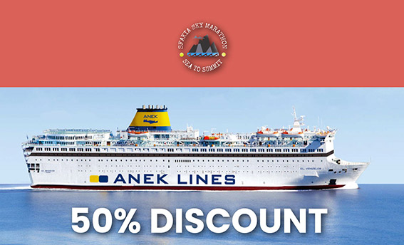 Χάρη στην υποστήριξη της συνεργάτης μας ANEK LINES Οfficial , κάθε διαγωνιζόμενος που συμμετέχει στον Sfakia Sky Marathon / Sfakia Vertical Run θα πληρώνει μόνο το 50% της τιμής του ακτοπλοϊκού εισιτηρίου (εξαιρούνται μονόκλινες και λουξ καμπίνες) στις γραμμές Πειραιάς – Χανιά και Χανιά – Πειραιάς. Μπορείτε να αγοράσετε εισιτήρια με έκπτωση 50% για την περίοδο από 24 έως 30 Οκτωβρίου, αλλά πρέπει να κάνετε κράτηση τουλάχιστον 5 ημέρες νωρίτερα. Κρατήσεις μπορούν να γίνουν με επίσημους αντιπροσώπους της Anek Lines.