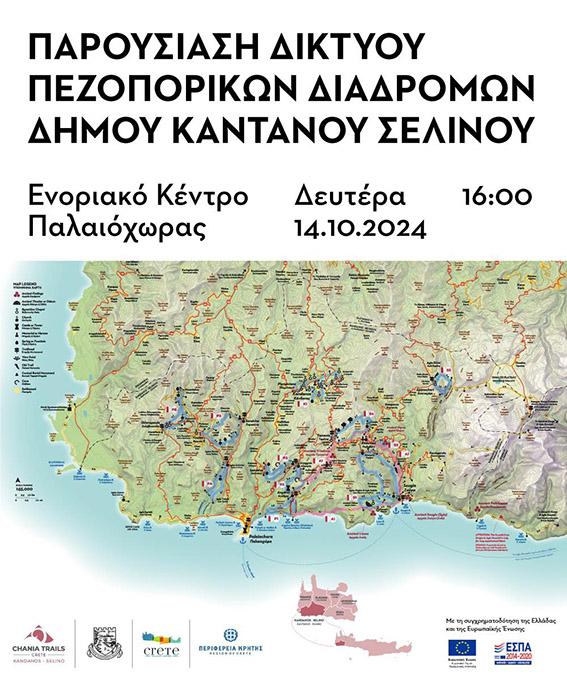 Ο Δήμος Καντάνου-Σελίνου μας προσκαλεί να παρακολουθήσουμε την επίσημη παρουσίαση του Δικτύου Πεζοπορικών Διαδρομών του Δήμου Καντάνου-Σελίνου, μία εαιρετικά ενδιαφέρουσα εκδήλωση με πολύ ενδιαφέρον.