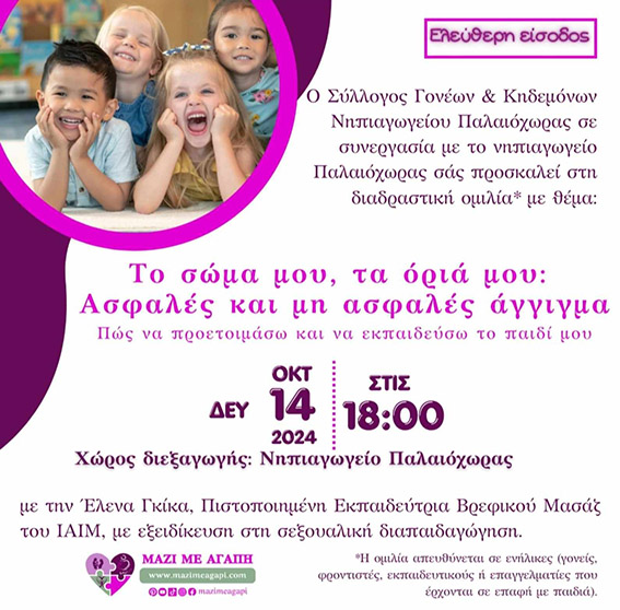 Από τον Σύλλογο Γονέων & Κηδεμόνων Νηπιαγωγείου Παλαιόχωρας σε συνεργασία με το Νηπιαγωγείο Παλαιόχωρας. Την ίδια μέρα, Δευτέρα 14/10 στις 6 το απόγευμα, στο Νηπιαγωγείο Παλαιόχωρας με την Έλενα Γκίκα, Πιστοποιημένη Εκπαιδεύτρια Βρεφικού Μασάζ του ΙΑΙΜ, με εξειδίκευση στη σεξουαλική διαπαιδαγώγηση.