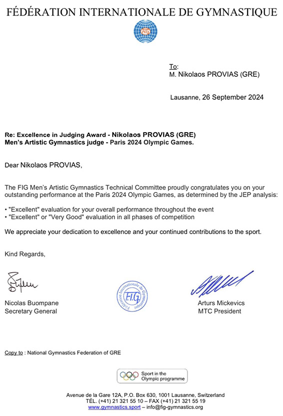 Στην πρόσφατη αξιολόγηση της FIG για τους Ολυμπιακούς του Παρισιού δέχτηκε συγχαρητήρια για τις εξαιρετικές επιδόσεις του ως κριτής, όπως είπε και ο ίδιος : “Με ιδιαίτερη χαρά ανακοινώνω ότι σύμφωνα με την αξιολόγηση της FIG κατέλαβα την πρώτη θέση στους πρόσφατους ολυμπιακούς αγώνες και έλαβα Συγχαρητήρια επιστολή από την παγκόσμια Ομοσπονδία που αναφέρει μεταξύ άλλων.