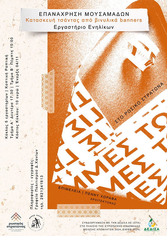 Ο Δήμος Χανίων και η ΔΕΔΙΣΑ ΑΕ (ΟΤΑ) στο πλαίσιο της Ευρωπαϊκή Εβδομάδας Μείωσης Αποβλήτων 2024 (EWWR 2024) ξεκινά τον Νοέμβριο στον Ρωσικό Στρατώνα για το ενήλικο κοινό του, δύο κύκλους σεμιναρίων κοπτικής ραπτικής με στόχο την ανακύκλωση των υλικών.