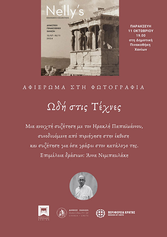 Την Παρασκευή 11 Οκτωβρίου 2024, στις 19.00 θα πραγματοποιηθεί αφιέρωμα στη φωτογραφία, με κεντρικό προσκεκλημένο τον Ηρακλή Παπαϊωάννου, επιμελητή του MOMus – Μουσείου Φωτογραφίας Θεσσαλονίκης, ο οποίος θα ηγηθεί μιας ανοιχτής συζήτησης για την έκθεση της Δημοτικής Πινακοθήκης Χανίων.