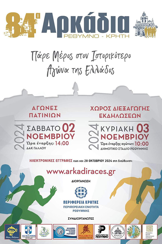 Φέτος τα 84α Αρκάδια θα διεξαχθούν στις 3 Νοεμβρίου 2024, ενώ συνεχίζονται οι εγγραφές όπου και θα ολοκληρωθούν τη Δευτέρα 28/10.