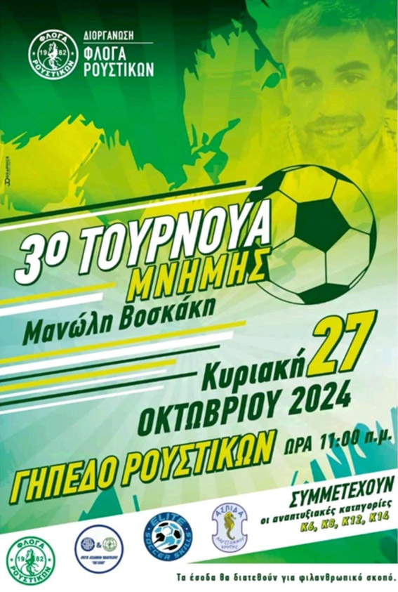 Ο Αθλητικός Όμιλος Φλόγα Ρουστίκων ανακοινώνει ότι την Κυριακή 27 Οκτωβρίου 2024 θα διεξαχθεί το 3ο τουρνουά στη μνήμη του «Μανώλη Βοσκάκη» στο γήπεδο των Ρουστίκων.