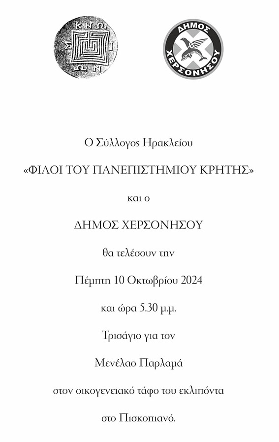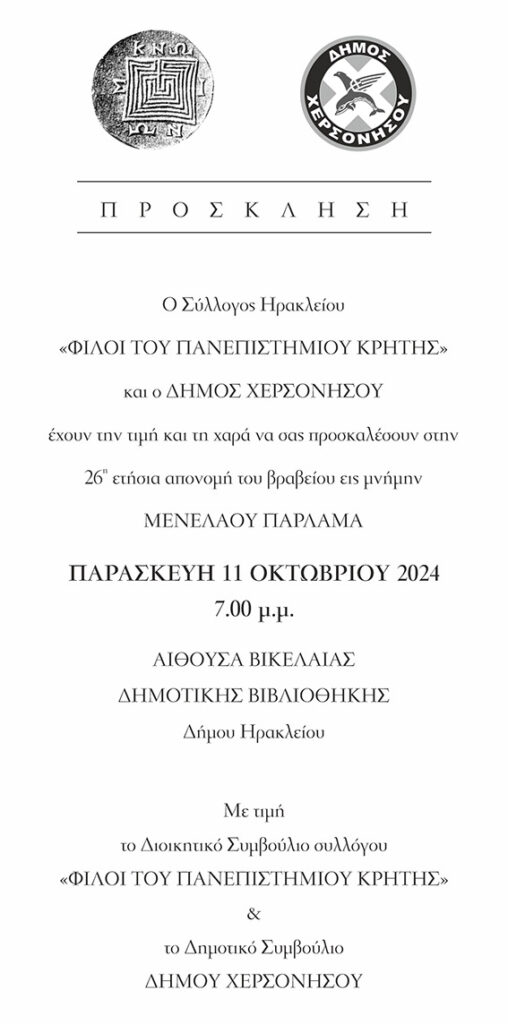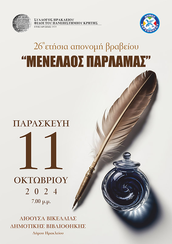 Ο Δήμος Χερσονήσου και ο Σύλλογος «Φίλοι του Πανεπιστημίου Κρήτης» σε συνεργασία με την Φιλοσοφική Σχολή του Πανεπιστημίου Κρήτης, οργανώνουν την 26η ετήσια απονομή του βραβείου εις μνήμην ΜΕΝΕΛΑΟΥ ΠΑΡΛΑΜΑ, την Παρασκευή 11 Οκτωβρίου 2024 και ώρα 19:00, στην αίθουσα της Βικελαίας Δημοτικής Βιβλιοθήκης (2ος όροφος).