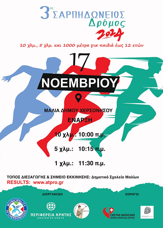 Την Κυριακή 17 Νοεμβρίου 2024 θα διεξαχθεί στα Μάλια Ηρακλείου Κρήτης, ο 3ος Σαρπηδώνειος Δρόμος με 10 χλμ., 5 χλμ. και 1000 μέτρα για παιδιά ως 12 ετών.