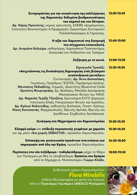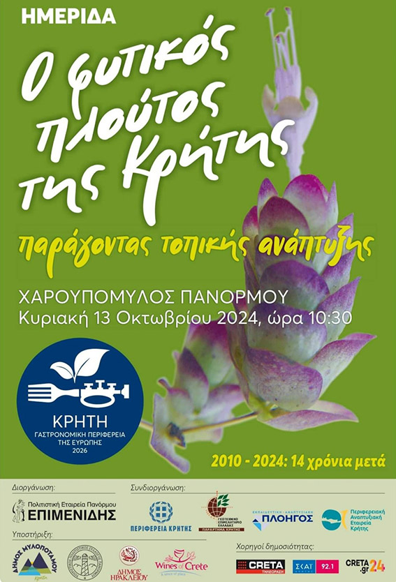 Δεκατέσσερα χρόνια μετά, την Κυριακή 13 Οκτωβρίου 2024, στις 10 το πρωί, προσεγγίζουμε το ίδιο θέμα, με τους ίδιους αλλά και με νέους εκλεκτούς εισηγητές, προσπαθώντας αφενός να ενημερωθούμε για την σημερινή πραγματικότητα με στόχο την προστασία και την ανάδειξη τού “Φυσικού Πλούτου της Κρήτης” και αφετέρου να ανιχνεύσουμε τις δυνατότητες δημιουργίας ενός βιώσιμου αναπτυξιακού μοντέλου που θα στηρίζεται σε αυτόν. Θα δοκιμάσουμε προϊόντα παραγωγών από όλη την Κρήτη και εκλεκτές γεύσεις της Κρητικής γαστρονομίας.