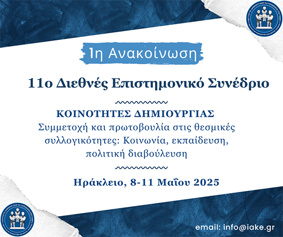 Το 11ο Διεθνές Επιστημονικό Συνέδριο του Ι.Α.Κ.Ε. αγκαλιάζει μια ευρεία αλλά και συνεκτική οικογένεια πεδίων και προβληματισμών που περιστρέφονται γύρω από τις κομβικής σημασίας έννοιες της κοινότητας δημιουργίας, της συμμετοχής και της συμμετοχικής πρωτοβουλίας.