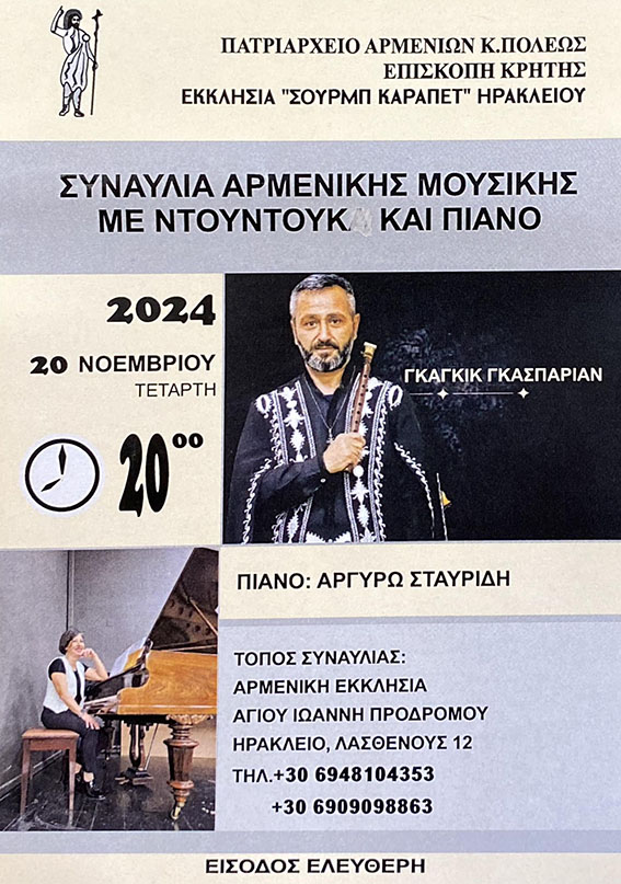 Πλήθος κόσμου κατέκλυσε, την Τετάρτη 20 Νοεμβρίου 2024, και τίμησε με την παρουσία του την εκδήλωση -συναυλία για Ντουντούκ και πιάνο με τους Gagik Gasparyan και Argyro Stavridi που οργάνωσε η Αρμενική παροικία Κρήτης.