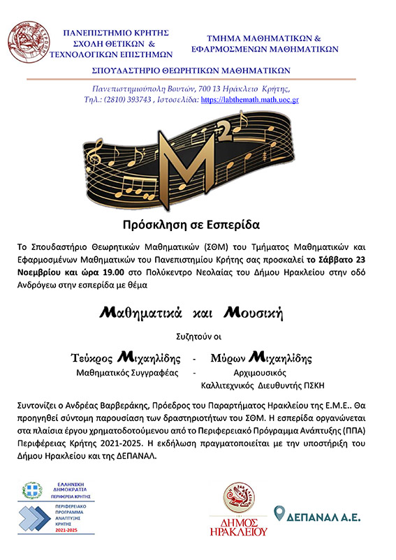 στο Πολύκεντρο Νεολαίας του Δήμου Ηρακλείου στην οδό Ανδρόγεω στην εσπερίδα με θέμα «Mαθηματικά και Mουσική».