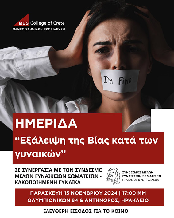 Το Κολλέγιο Κρήτης MBS και ο Σύνδεσμος Μελών Γυναικείων Σωματείων Union of Women Association, σας προσκαλούν στην ανοιχτή ημερίδα που θα πραγματοποιηθεί στις εγκαταστάσεις του Κολλεγίου, με θέμα την εξάλειψη της βίας κατά των γυναικών.