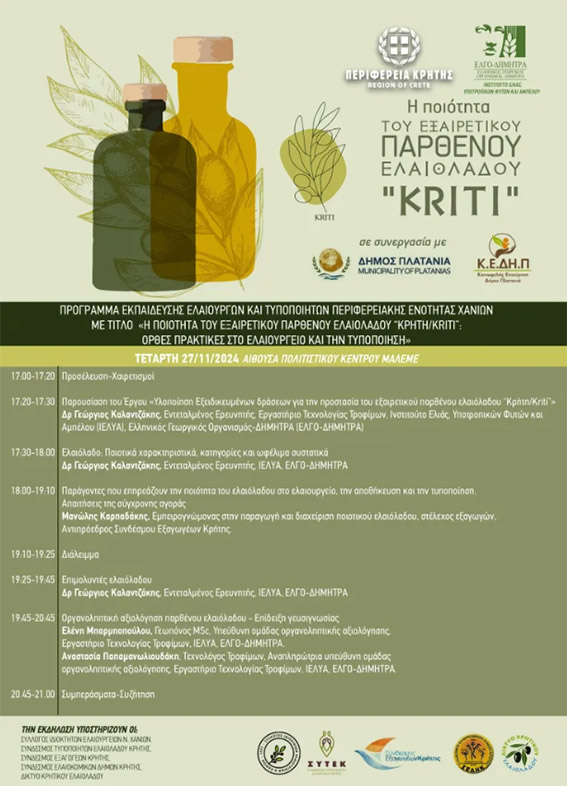 με θέμα: «Η ποιότητα του Εξαιρετικού Παρθένου Ελαιόλαδου “Κρήτη/Kriti”: Ορθές πρακτικές στο ελαιουργείο και την τυποποίηση».