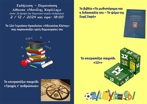 Το 12ο Γυμνάσιο Ηρακλείου «Οδυσσέας Ελύτης» σας προσκαλεί σε μια ξεχωριστή εκδήλωση που αναδεικνύει τη δυναμική και την πρωτοπορία της σχολικής κοινότητας.
