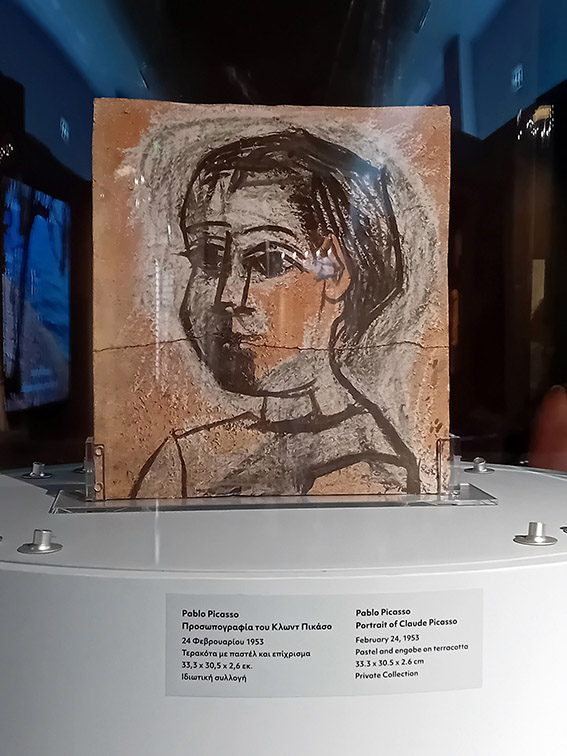 Η τετράγωνη κεραμική πλάκα με το πορταίτο του Κλωντ Πικάσο, γιού του μεγάλου ζωγράφου, είναι δημιούργημα του Πάμπλο Πικάσο του 1953, όταν δηλαδή ο Κλώντ θα ήταν 6-7 ετών. Με μοναδικό τρόπο ο πατέρας αποτυπώνει τα χαρακτηριστικά του γιου του, όταν δηλαδή ο Πικάσο ήταν ήδη 72 ετών και το λέω αυτό γιατί εδώ φαίνονται ότι οσμώνονται ρεύματα του κλασικού, του κυβισμού κλπ, από τα οποία είχε περάσει ο καλλιτέχνης σε προηγούμενες δεκαετίες της ζωής του.