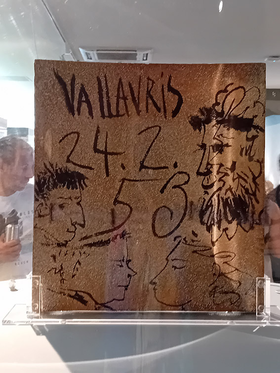 Στο πίσω μέρος της πλάκας ξεχωρίζει ο τόπος και η ημερομηνία: Vallauris 24-2-1953 με 5 μορφές, σκίτσα-προσωπογραφίες ανάμεσα στα οποία μπορεί ίσως να αναγνωρίσει κανείς το ζεύγος Ραμιέ (;), τους κεραμίστες που γνώρισε και συνεργάστηκε μαζί τους ο Πικάσο μετά τη λήξη του Β’ Παγκοσμίου Πολέμου.