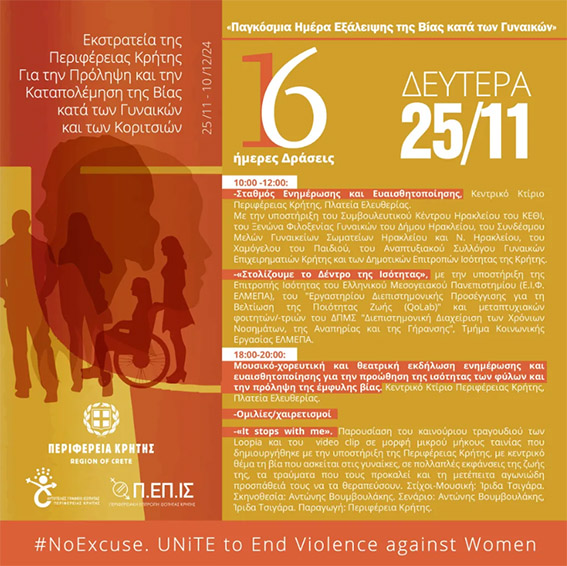 από τις 25 Νοεμβρίου 2024 «Παγκόσμια Ημέρα Εξάλειψης της Βίας κατά των Γυναικών», έως τις 10 Δεκεμβρίου 2024, «Παγκόσμια Ημέρα Ανθρωπίνων Δικαιωμάτων».