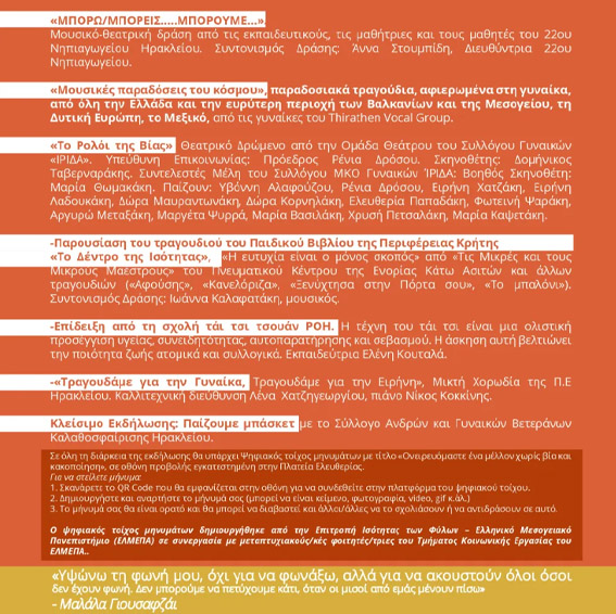 Όπως δήλωσε η Αντιπεριφερειάρχης Πολιτισμού και Ισότητας της Περιφέρειας Κρήτης, Γεωργία Μηλάκη: «Η βία κατά των γυναικών αποτελεί μια από τις πιο σοβαρές παραβιάσεις ανθρωπίνων δικαιωμάτων, με διαχρονικές και παγκόσμιες διαστάσεις.