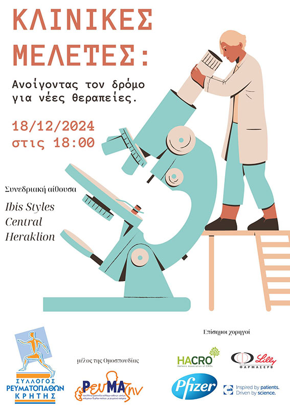 Ο Σύλλογος Ρευματοπαθών Κρήτης, καθώς αυξάνονται οι ανάγκες των ασθενών για καινοτόμες θεραπείες, και με το δεδομένο ότι οι κλινικές μελέτες είναι ο μοναδικός δρόμος που οδηγεί σε αυτό, σε συνεργασία με τη Ρευματολογική, Δερματολογική και Γαστρεντερολογική Κλινική του ΠαΓΝΗ,