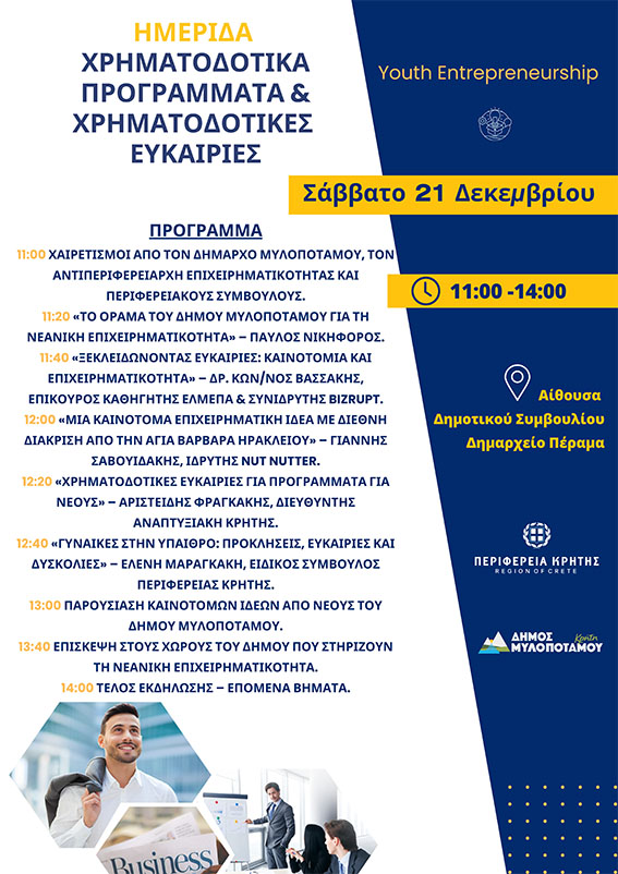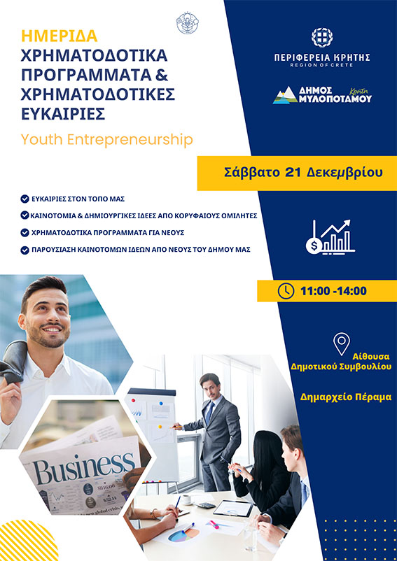 Ο Δήμος Μυλοποτάμου, σε συνεργασία με την Περιφέρεια Κρήτης, σας προσκαλεί να παρακολουθήσετε την Ημερίδα με θέμα «Χρηματοδοτικά Προγράμματα & Χρηματοδοτικές Ευκαιρίες», που θα πραγματοποιηθεί το