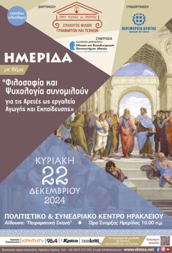 Η Ημερίδα πραγματοποιείται με την υποστήριξη της Περιφέρειας Κρήτης και τη Συνεργασία του Εργαστηρίου Φιλοσοφικής Συμβουλευτικής και Φιλοσοφίας της.