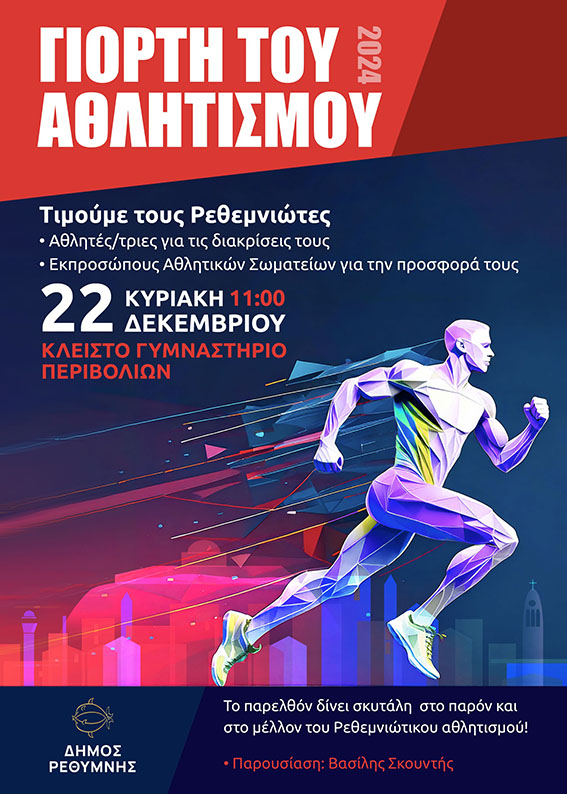 Στην εκδήλωση θα βραβευθούν επίσης οι αθλητές και οι αθλήτριες που προέρχονται από το Ρέθυμνο και διακρίθηκαν σε Διεθνείς Διοργανώσεις, Πανελλήνια Πρωταθλήματα και Σχολικούς Αγώνες του 2024.