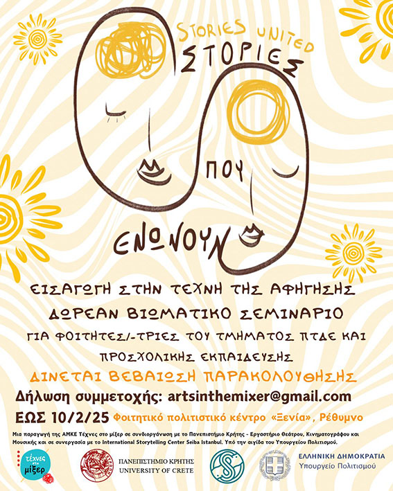 Υπό την αιγίδα και με επιχορήγηση του Υπουργείου Πολιτισμού ], η εταιρία Τέχνες στο μίξερ σε συνεργασία με το Πανεπιστήμιο Κρήτης προσκαλεί φοιτητές/-τριες (σε προπτυχιακό ή μεταπτυχιακό επίπεδο) με ή χωρίς προϋπάρχουσα εμπειρία στην αφήγηση ή/και στο θέατρο