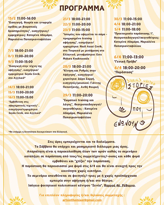 22/3, 11:00-20:00 – “Ιστορίες που αφηγείται το σώμα – προχωρημένο training αφήγησης”, εισηγήτρια/εμψυχώτρια: Nazli Azazi Cevik, στα Τουρκικά με μετάφραση στα Ελληνικά, μεταφράστρια: Esra Makara Koukousoula