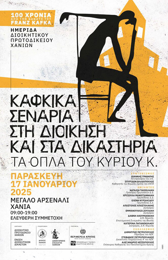 Το Διοικητικό Πρωτοδικείο Χανίων και η Ένωση Διοικητικών Δικαστών, με αφορμή τα 100 χρόνια από το θάνατο του Franz Kafka διοργανώνουν ημερίδα με θέμα